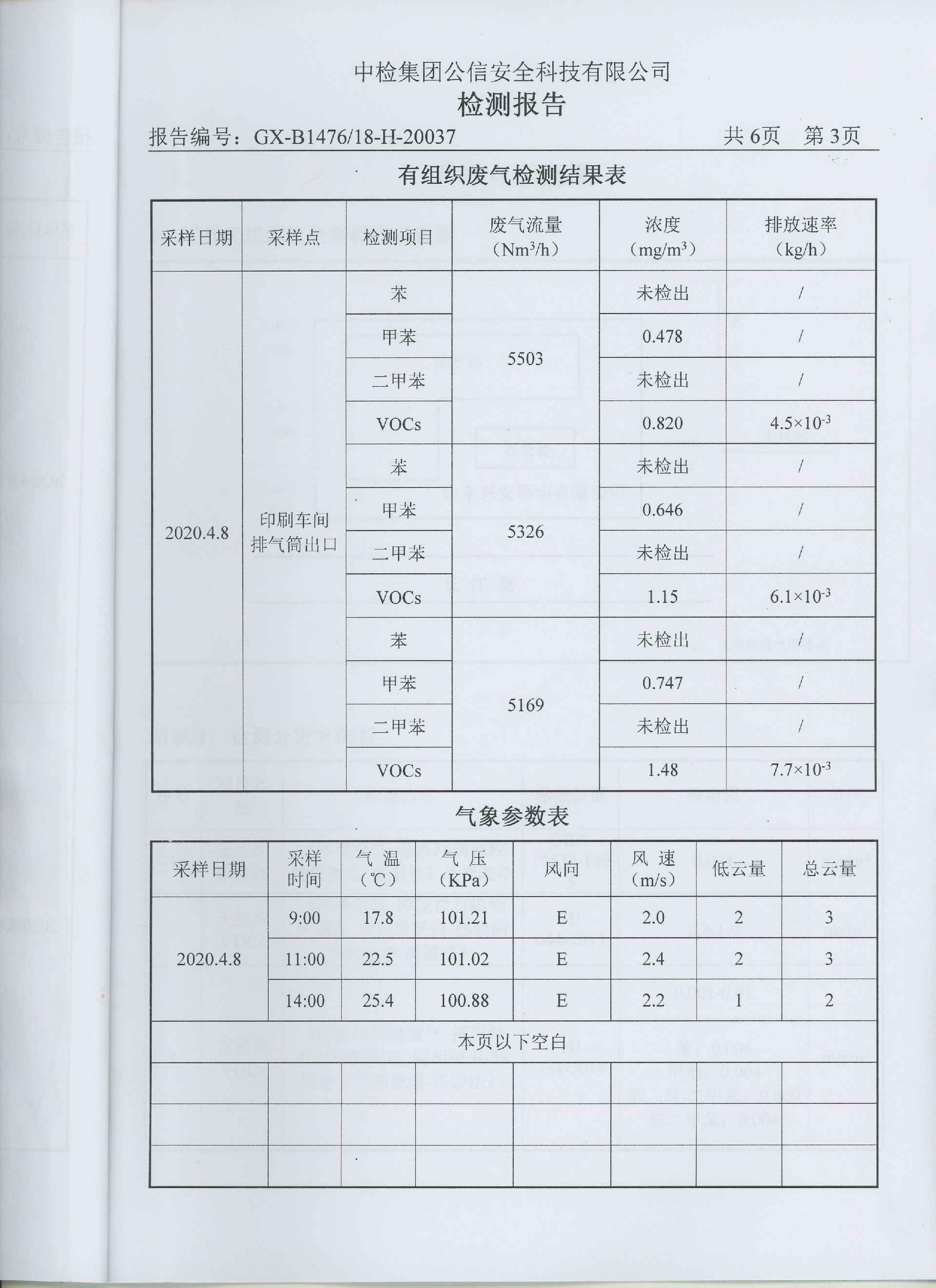 南京鑫宇文化遗产推广有限公司一直把环保治理工作作为企业发展重中之重,根据市区生态环境保护局要求于2017年8月份率先上了Ⅴ0Cs环保处理设备,印刷车间废气通过收集风管,进入过滤器,将空气颗粒物过滤掉,经过光催化氧化分解剩余有机废气,同时由离子氧化进一步处理残余废气,将有机废气氧化成二氧化碳和水,通过烟囱引高排。2018年2月经有关环保专家验收合格,有机挥发物排放达标。每季度都委托枣庄公信安全科技公司对公司有机挥发物废气各项指标进行检测,下图为最新监测数据: